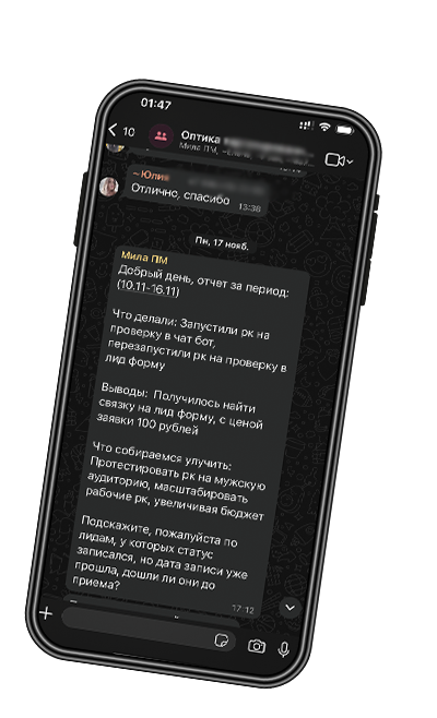 Ваш проект под нашим контролем, мы буквально каждый день отслеживаем метрики и ставим задачи с дедлайнами. Вы всегда можете узнать статус задачи или запросить созвон с командой